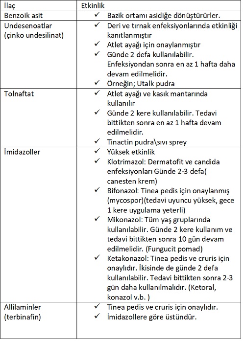 Hafif ya da orta şiddette tinea pedis veya tinea manujmda azol, alilamin, sikloproks, tolnaftat, undesilinik asit gibi ajanların günde 1 veya 2 kez kullanımı yeterlidir.
