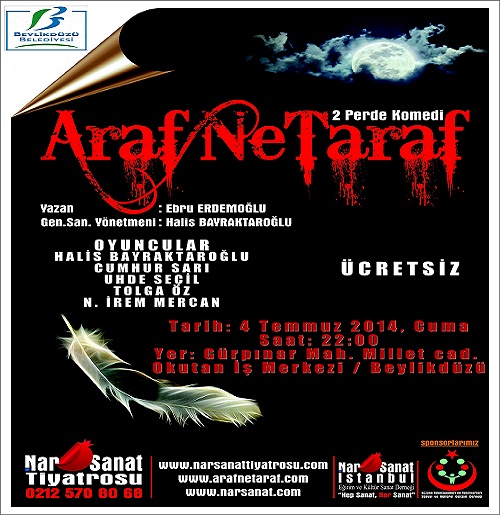Ebru ERDEMOĞLU’nun kaleme aldığı Genel Sanat Yönetmenliğini Halis BAYRAKTAROĞLU’nun üstlendiği ARAF NE TARAF, bir NAR SANAT TİYATROSU prodüksiyonudur.