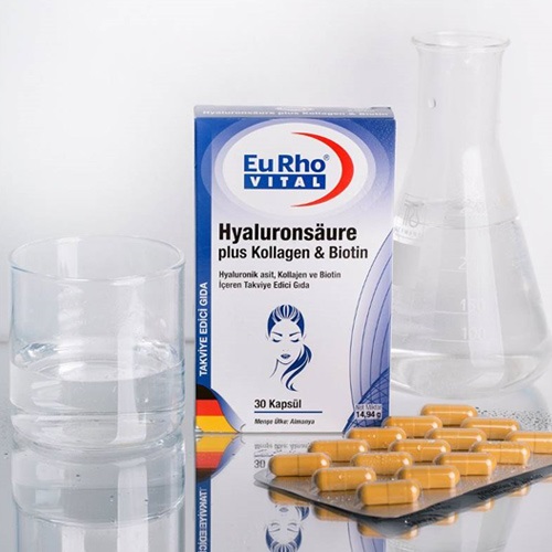 EuRho® Vital bir Alman markasıdır. EuRho® Vital markasının ürün skalası kombine olan ürünlerden oluşur. Bunun nedeni tek ürün ile tüketicinin ihtiyacı olan besin öğelerini optimal dozlarda sunmaktır. Böylelikle dokunun ihtiyacı olan etken maddeleri bir arada vererek hem sinerjik etkinlik sağlanmakta hem de daha optimal sürelerde etkinlik görülmektedir. EuRho® Vital Hyaluronsäure plus Kollagen & Biotin, cilt sağlığını desteklemek amacıyla hyaluronik asit, Peptan teknolojisi ile üretilmiş hidrolize Tip 1 Kolajen, C vitamini ve biotin içerir. İçeriğindeki dört temel etken madde ile cildinizin ihtiyaçlarını karşılayarak cildinizin güzelliğini geri kazanmanıza destek olur.