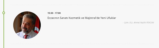 Uzm.Ecz.Ahmet Nezihi PEKCAN, 15 Kasım perşembe günü saat:15.30-17.00 saatleri arasında, "Eczacının Sanatı Kozmetik ve Majistralde Yeni Ufuklar" başlıklı sunumunu gerçekleştirecek.