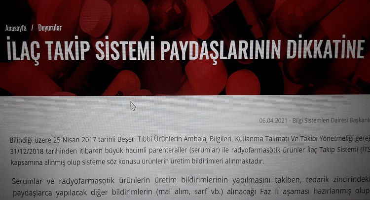 Bilindiği üzere 25 Nisan 2017 tarihli Beşeri Tıbbi Ürünlerin Ambalaj Bilgileri, Kullanma Talimatı Ve Takibi Yönetmeliği gereği 31/12/2018 tarihinden itibaren büyük hacimli parenteraller (serumlar) ile radyofarmasötik ürünler İlaç Takip Sistemi (İTS) kapsamına alınmış olup sisteme söz konusu ürünlerin üretim bildirimleri alınmaktadır.