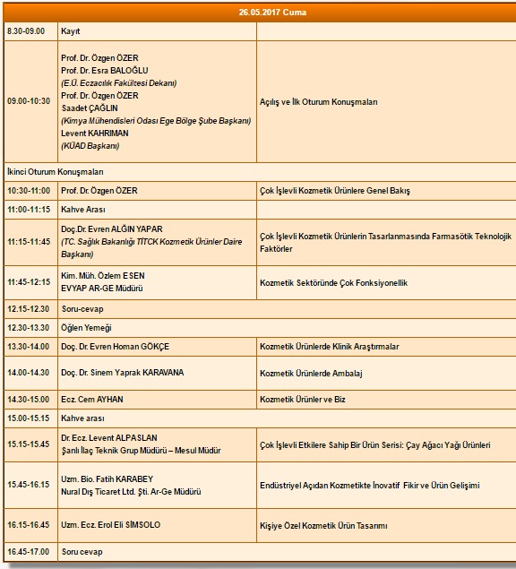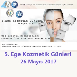 26 Mayıs 2017 tarihinde Ege Üniversitesi Eczacılık Fakültesi Farmasötik Teknoloji Anabilim Dalı/Kozmetoloji Bilim Dalı tarafından, ilgili paydaşların katılımıyla düzenleyeceğimiz 5.Ege Kozmetik Günleri: Çok işlevli Kozmetikler; Kozmetik Ürünlerde Güncel Yaklaşımlar konulu toplantı programımız aşağıda olup, kozmetik sektöründeki yeni yaklaşımları ve önerileri tartışacağımız, yol gösterici olacağına inandığımız toplantımıza katılımınızı bekliyoruz.