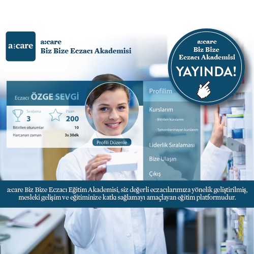 a:care Biz Bize Eczaci Akademisi, eczacılarımızın sürekli tıp eğitimlerine katkı sağlamak ve mesleki gelişimlerini desteklemek amacıyla hazırlanmış, güncel ve ilgi çekici konuları içeren eğitim platformudur.