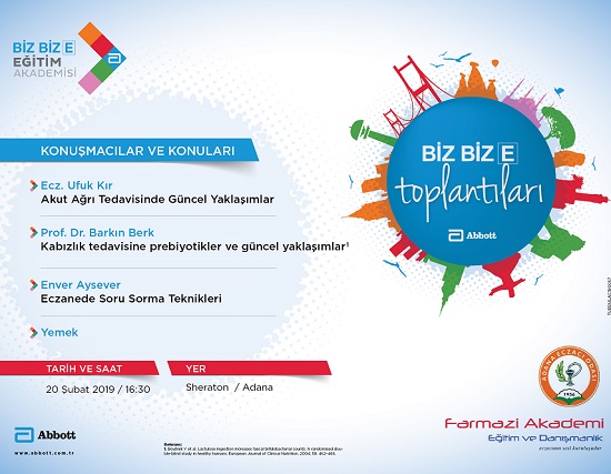 Abbott ve Farmazi Akademi’nin 20 Şubat 2019 Çarşamba günü saat 18:00’da, Sheraton-Adana’da düzenlediği yemekli eğitim toplantısına davetlisiniz.