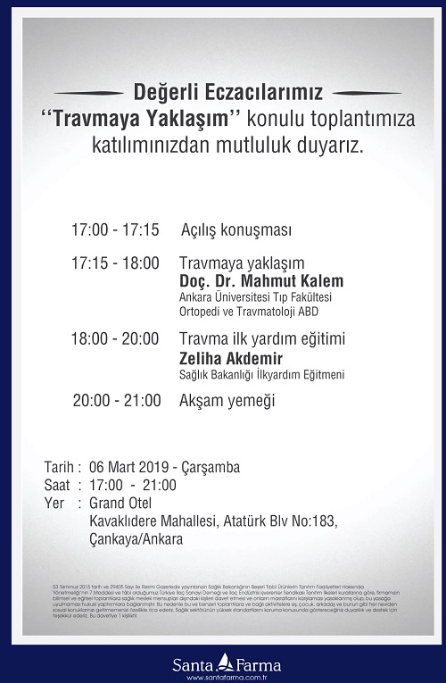 Santa Farma ve Farmazi Akademi’nin 6 Mart 2019 Çarşamba günü saat 17:00’de, Grand Otel-Ankara’da düzenlediği yemekli eğitim toplantısına davetlisiniz.