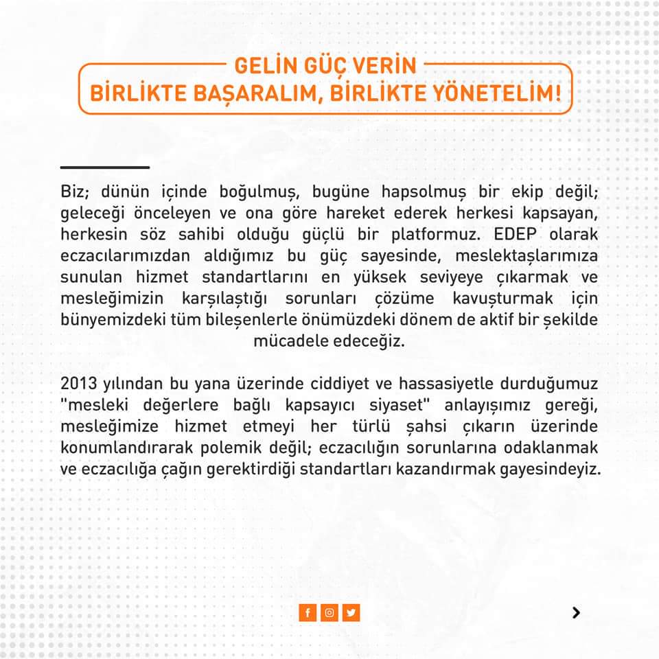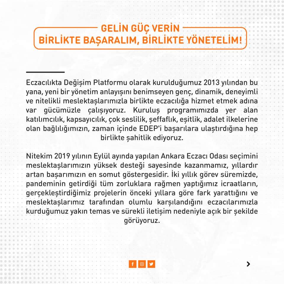 Ankara Eczacı Odası’ nda, yönetimde olan Eczacılıkta Değişim Platformu (EDEP), önümüzdeki dönem yapılacak olan AEO seçimlerine (Eylül- 2021) yeniden mevcut Başkan Ecz. Taner Ercanlı’ nın Başkan adaylığında katılma kararı aldı.