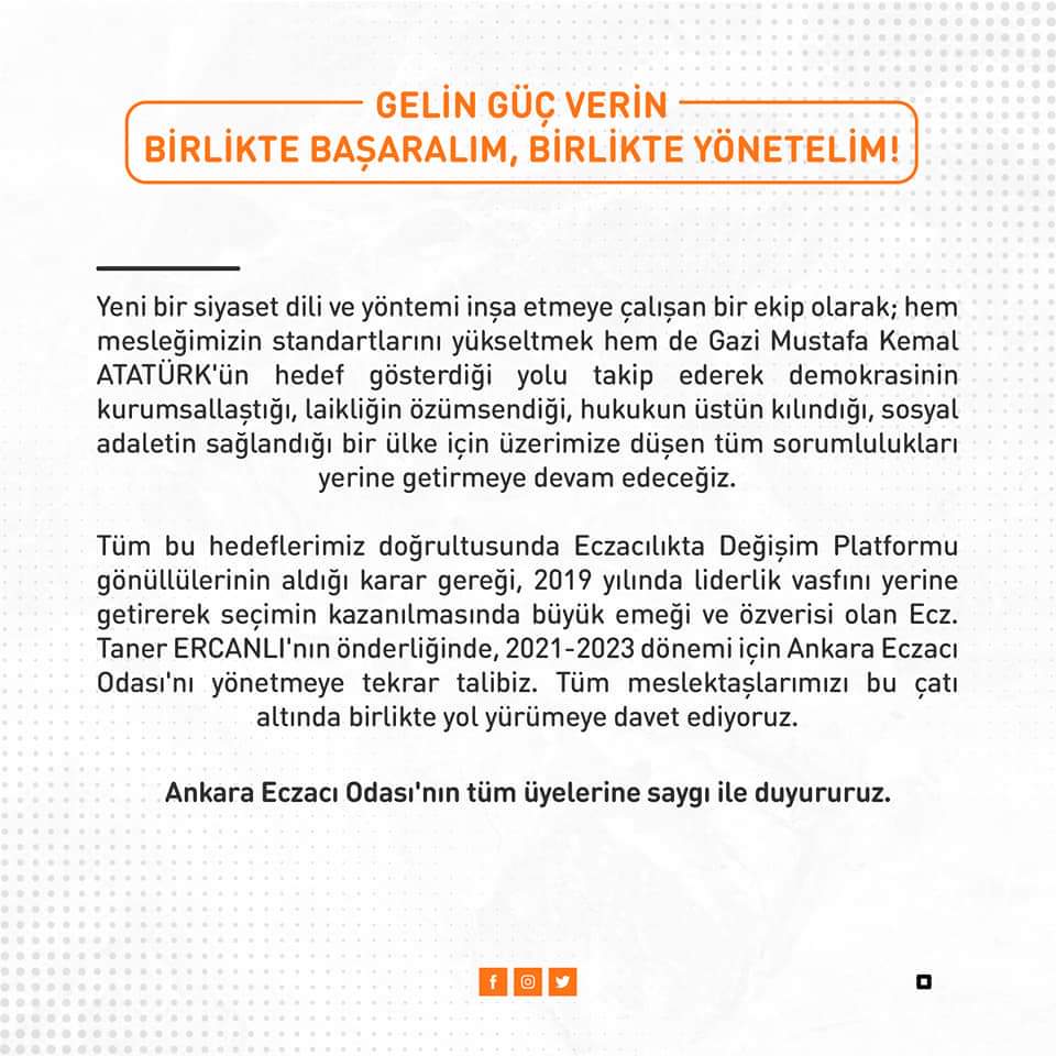 29 Haziran'da Latanya Otel'de değerli meslektaşlarımızla gerçekleştirdiğimiz toplantıda, 2021-2023 dönemi için Ankara Eczacı Odası'nı yönetmeye Ecz. Taner Ercanlı liderliğinde yeniden talip olduğumuzu eczacı kamuoyuna duyurduk.”