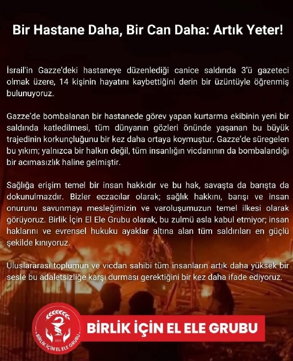 Eczacı Odaları’ nın oluşturduğu Birlik İçin El Ele Grubu İsrail’ in Gazze’ de gerçekleştirdiği katliam ve insanlık suçlarını işleyen bir açıklama yaptı: