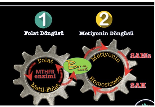Gıdalardan alınan folat İle metilasyon döngüsünü start alır. Folat’ın aktiflenmesi için bir metil grubu bağlanması gerekir. Bildiğimiz üzere folat’ın sentetik formu folik Asittir .Folat döngüsü metiyonin döngüsünü çalıştırır. Metiyonin döngüsü homosisteinin metiyonine dönüşümünü sağlar. Bu döngüyü çalıştıran en önemli unsur ise b12 vitaminidir. b12’nin aktif hale gelebilmesi için önce metillenmesi gerekir. Metil kobalamin b 12 aktif formudur ve metiyonin döngüsünü çalıştırarak, SAME olarak adlandırılan S-adenozil metionine haline gelir. Same vücuttaki bütün biyokimyasal işlemler için en önemli metil donörüdür.