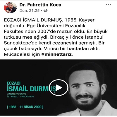 Sağlık Bakanı Dr. Fahrettin Koca, sosyal medya hesabından yaptığı paylaşımla, Covid- 19 nedeniyle kaybettiğimiz, meslektaşımız Ecz. İsmail Durmuş’ u anarak, “minnettarız” dedi.