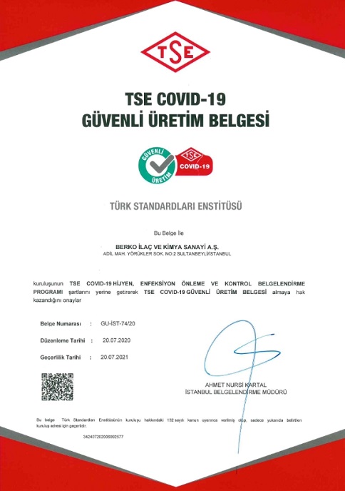 Otuz beş yılı aşkın süredir “Sağlıklı Yarınlara” vizyonuyla, toplum sağlığı için çalışan ve üreten Berko İlaç, tüm dünyayı etkisi altına alan COVID-19 pandemisinin ülkemizde görülmeye başladığı dönemden itibaren, üretim ve çalışma alanlarında aldığı önlemlerle, çalışanları için hayata geçirdiği üst düzey hijyen tedbirleriyle ve tüm paydaşlarını gözeten uygulamalarıyla Türk Standartları Enstitüsü (TSE) tarafından verilen “COVID-19 Güvenli Üretim Merkezi Belgesi” almaya hak kazandı.