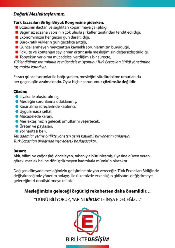 TEB seçimlerine sayılı günler kala, Başkan adayının Ecz. İrfan Demirci' nin olduğu Birlikte Değişim Grubu, Eczacı Kamuoyuna yönelik bir manifesto yayımladı.
