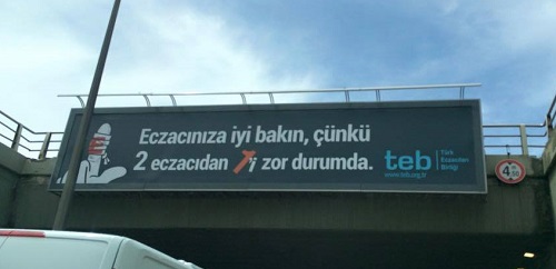 Söz konusu afişte "Eczacınıza iyi bakın çünkü 2 eczacıdan biri zor durumda" yazıyor.