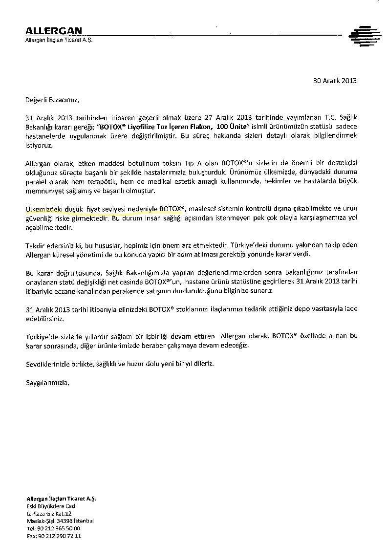 Allergan Firması tarafından, bugün (30.12.2013) tarihli olarak Birliğimize gönderilen yazı ile, 31 Aralık 2013 tarihinden itibaren geçerli olmak üzere 27 Aralık 2013 tarihinde yayımlanan T.C. Sağlık Bakanlığı kararı gereği; “BOTOX® Liyofilize Toz İçeren Flakon 100 Ünite” isimli ürünün statüsünün, sadece hastanelerde uygulanmak üzere değiştirildiği ve bu karar doğrultusunda, Sağlık Bakanlığı ile yapılan değerlendirmelerden sonra Bakanlık tarafından onaylanan statü değişikliği neticesinde BOTOX®’un, hastane ürünü statüsüne geçirilerek 31 Aralık 2013 tarihi itibariyle eczane kanalından perakende satışının durdurulduğu bildirilmektedir.
