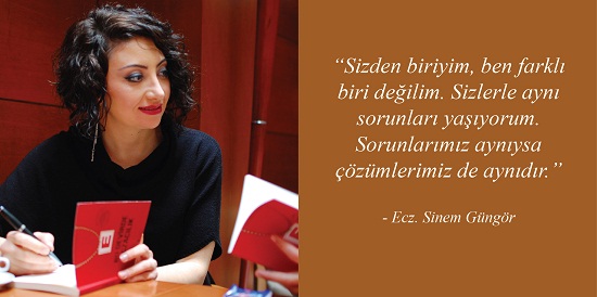 Sinem Güngör: Kesinlikle. Baştan şunu düşünüyoruz; “nasıl olsa hiçbirisine ulaştıramayacağım, nasılsa hiçbirine yetişemeyeceğim, o yüzden ben en baştan vazgeçeyim.” Bu doğru değil. Bir adım attığımızda sonuç alacağız. Zaten kitapta da fark etmişsinizdir. Kitapta da şöyle birşey var: Bizim bütün derdimiz şimdi ve burası ve elimizdeki koşullarla ne yapabiliyoruz. Şimdi ne yapabiliyoruz, burada ne yapabiliyoruz ve elimizdeki koşullarla ne yapabiliyoruz; yani ben size ütopik birşeylerden bahsetmiyorum. Kendi inanmadığım birşeyi de anlatmıyorum. Eczacıların en büyük problemi bence şu...