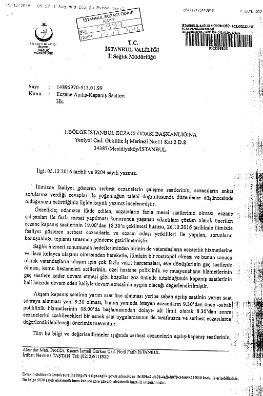İl Sağlık Müdürlüğü 15 Aralık 2016 tarihinde İstanbul Eczacı Odası’ na resmi bir yazı yazarak yeni düzenlemeyi kabul etmediğini, onaylamadığını duyurdu.