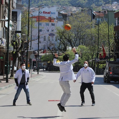 Sokağa çıkma kısıtlamasıyla birlikte boş kalan caddeyi bölgedeki eczacılar voleybol oynamak için kullandı.