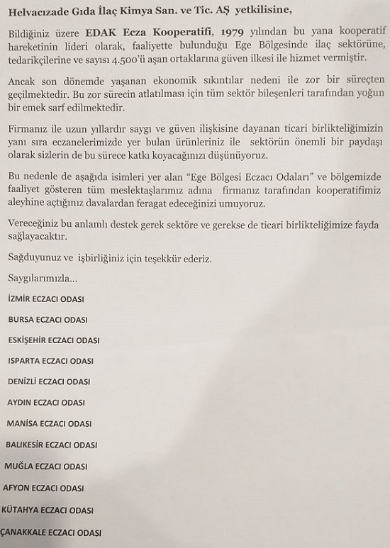 Ege Bölgesi Eczacı Odaları, EDAK Ecza Kooperatifi’ nin borçlarından dolayı, Helvacızade Gıda ve İlaç’ a yönelik olarak açık bir mektup yayınlayarak "açılan davalardan feragat" istediler.