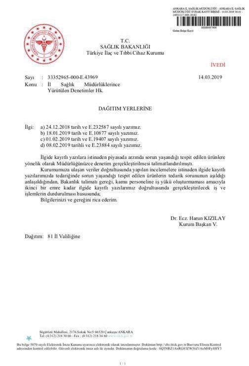 İl Sağlık Müdürlüklerine gönderilen, Dr. Ecz. Harun Kızılay (Kurum Başkan V.) imzalı 14.03.2019 tarihli yazı İVEDİ ibaresi ile gönderildi.