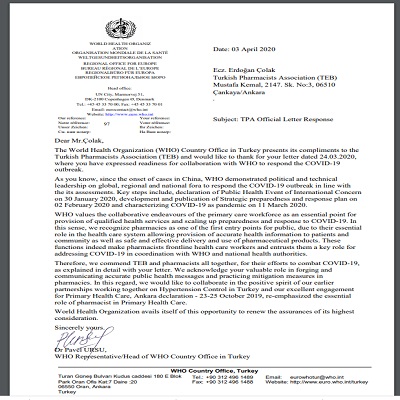Dünya Sağlık Örgütü Türkiye Ofisi, TEB Başkanı Ecz. Erdoğan Çolak’ a bir yanıt mektubu gönderdi