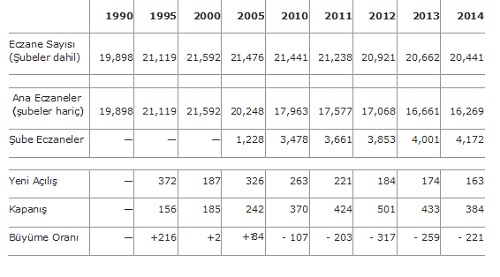 Aşağıdaki tabloda daha net göreceğiniz gibi eczane sayısı 2009 yılından beri düşüş göstermektedir. 2014 istatistiklerine göre son eczane sayısı 20,441 olup bu rakam 1990 yılından beri en düşük seviyesine ulaşmıştır. Bunun da sebebi sağlık hizmetleri ile ilgili siyasi durumlarla beraber, eczaneler arası rekabetin artışı hatta şube eczanelerin bir miktar artışı sebebiyle yeni eczanelerin açılmasının rekabet dolayısıyla daha da zorlaşmasıdır.