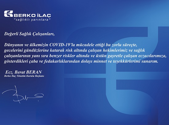 Berko İlaç Yönetim Kurulu Başkanı Sayın Ecz. Berat BERAN, sağlık çalışanları için teşekkür mesajı iletti.