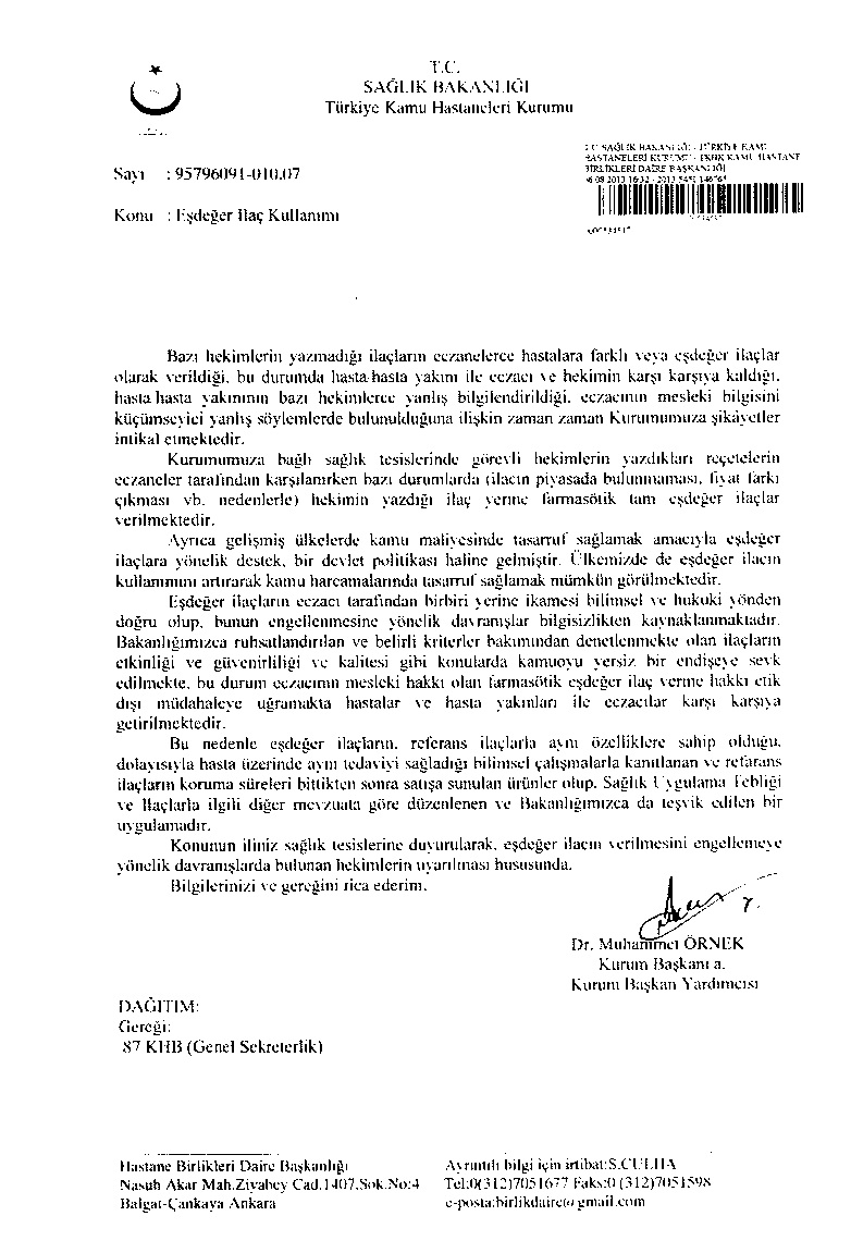 Konunun illerde bulunan sağlık tesislerine duyurularak, eşdeğer ilacın verilmesini engellemeye yönelik davranışlarda bulunan hekimlerin uyarılması hususu belirtilmektedir.