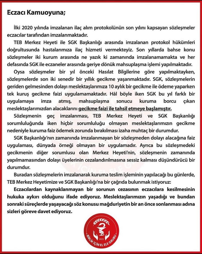 Bir grup eczacı odası tarafından oluşturulan Birlik İçin El Ele Grubu bir açıklama yayımlayarak SGK’ nın ek protokolünün gecikmesi nedeniyle uygulanan faize karşı çıktı.