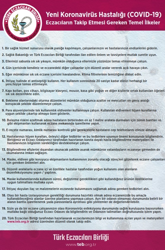 Türk Eczacıları Birliği (TEB) resmi web sitesinden “Yeni Koronavirüs Hastalığı (COVID-19) Eczacıların Takip Etmesi Gereken Temel İlkeler” başlıklı bir çalışma yayımladı.