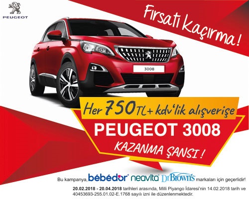 Bebedor ve Neavita markalarının sahibi, Dr Brown’s markasının ise temsilcisi Birlik Dış Ticaret, ürünlerinin geleceğin umudu çocuklara ulaşmasında büyük rol oynayan eczacılara, yepyeni, sıfır, 180.000 TL değerinde bir Peugeot 3008 hediye ediyor.