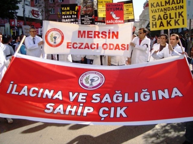 BASINA VE ECZACI KAMUOYUNA; Değerli meslektaşlarım, Sağlık çalışanları, Değerli halkımız, çok kıymetli basın mensupları; Sağlıkta dönüşüm programının son aşamasına geldik, artık sağlık alanı sonu olmayan bir yıkım sürecine girdi. Ülkemiz hızla sosyal devlet olmaktan uzaklaşıyor. Anayasal hak olan sağlıklı yaşam hakkı özelleştiriliyor. Özellikle son birkaç ayda, Meclis açıkken, meclis iradesini yok sayarak çıkarılan Kanun Hükmünde Kararnamelerle “sağlık haklarımız” elimizden alınıyor. Bu kararnamelerle; Yabancı hekimlere çalışma izni verildi, artık halk sağlığı İthal hekimlere teslim edilecek, Devlet hastanelerimizi, önümüzdeki yıldan itibaren, şirket hastanelerine dönüştürecek olan “kamu hastane birlikleri” yasası çıkarıldı. Halkın hastaneleri kısa zamanda özelleştirilecek ve halkın olmaktan çıkarılacaktır. Tıpkı eczanelerimizin, Halkımızın eczanelerinin yok edilip, yerine uluslar arası sermayeye ait zincir eczanelerinin kurulmak istenmesi gibi. Tüm bunlar sağlığın özelleştirilmesi sürecinin birer parçasıdır. Önümüzdeki günlerde pek çok insanımız ödenen bunca dolaylı ve dolaysız vergiye rağmen Genel Sağlık Sigortası (GSS) çatısı altına giremeyecek ve bizler daha çok vergi ödemek zorunda kalacağız. 1 Ocaktan sonra şu anda yaklaşık 10 milyon olan Yeşil Kartlı sayısının 3-4 milyona indirilmesi gündemde. Yeşilkart Sosyal Güvenlik Kurumuna devrediliyor. Bunun anlamı aylık geliri 270 TL üzerinde olan kişilerin de artık prim ödeyecek olmasıdır. Artık paran kadar sağlık dönemi başlıyor. Sağlık alanında balayı kısa sürdü. Şimdi artık Sağlıkta dönüşüm programının çirkin yüzü ortaya çıkıyor. Sağlık alanını oy deposuna çevirenler için, artık deniz bitti. Mesleğimizde de telafisi mümkün olmayan kayıplar yaşamaktadır. Son yayınlanan Kanun Hükmünde Kararnameler, İlaç Fiyat Kararnamesi ve Sağlık Uygulama Tebliği değişiklikleri eczacılığı yok olma noktasına getirdi. Son Yapılan düzenlemeler ile birlikte;