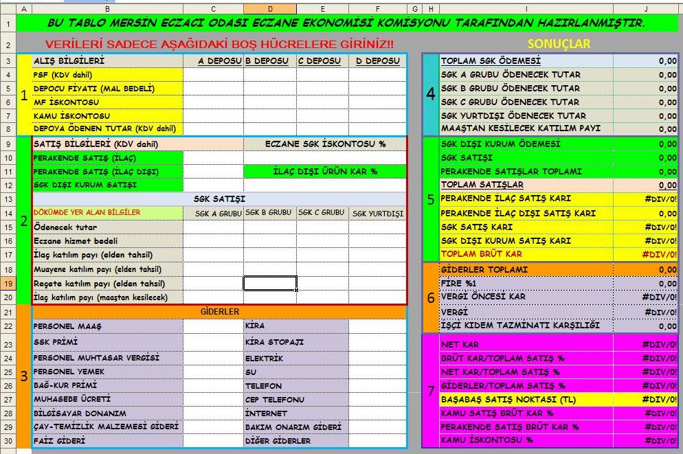 Komisyonumuz eczane ekonomilerimizin giderek kötüleştiği günümüzde birçok eczacımızın gerçek durumlarını göremedikleri, hesaplarını doğru bir şekilde yapamadıklarını göz önüne alarak eczanelerde karlılık hesaplarını her eczacımızın kendi hesaplayabileceği bir tablo oluşturmuş ve kullanımınıza sunmuştur. Bu tablo ile ayrıntılı bir şekilde karlılık analizi yapabilir, eczanelerimizde alabileceğimiz tedbirleri gözden geçirebiliriz.