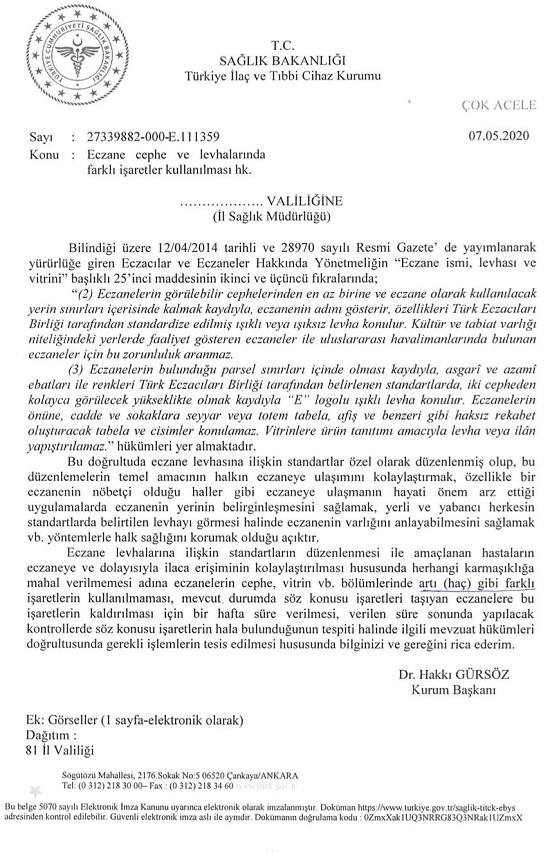 Bu işaretleri taşıyan eczanelere 1 hafta süre verilmesi, söz konusu işaretlerin kaldırılmaması durumunda işlem yapılması istendi.