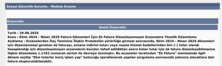 Ek Fatura Kesemeyenlerle İlgili Medula duyurusu