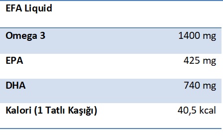 EFA Liquid bir tatlı kaşığında yüksek ve klinik çalışmalardaki dozu karşılayabilecek düzeyde omega 3 ve EPA içermektedir.