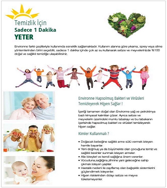İçeriği tamamen doğal olan Environne yağ ve petrokimya bazlı kimyasal kalıntıları çözer.Ayrıca sebze ve meyvelerin üzerindeki mumlu tabakayı ve bu tabakanın içerisinde hapsolmuş bakteri ve virüsleri temizleyerek hijyen sağlar.