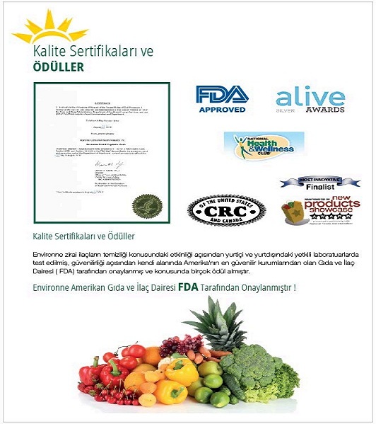 Environne zirai ilaçların temizliği konusundaki etkinliği açısından yurtiçi ve yurtdışındaki yetkili laboratuarlarda test edilmiş, güvenilirliği açısından kendi alanında Amerika’nın en güvenilir kurumlarından olan Gıda ve İlaç Dairesi ( FDA) tarafından onaylanmış ve konusunda birçok ödül almıştır.