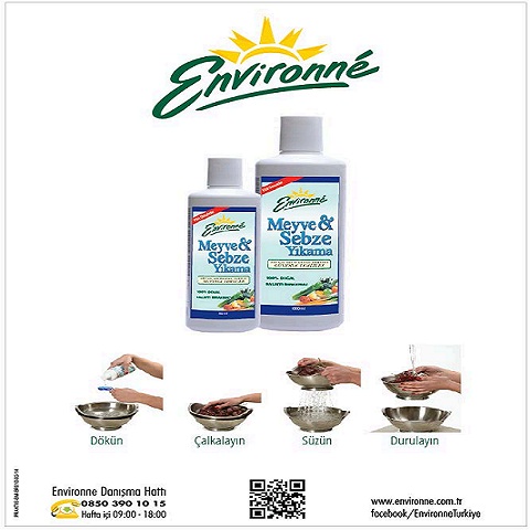 İçeriği tamamen bitkisel bileşenlerden oluşan Environne yağ ve petrokimya bazlı bu tür kimyasal kalıntıları çözer.Ayrıca meyve ve sebzenin üzerindeki yağlı ve mumlu tabakayı ve bu tabakanın içerisinde hapsolmuş bakteri ve virüsleri temizleyerek sağlıklı ve hijyenik sebze ve meyve yemenizi sağlar.