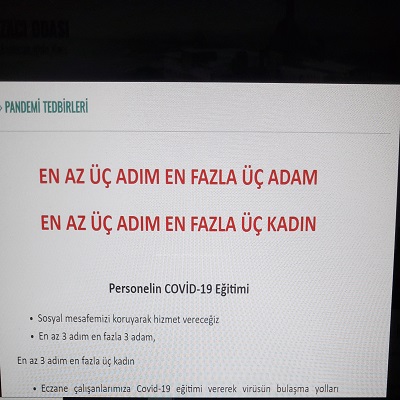 Eczane çalışanlarımıza Covid-19 eğitimi vererek virüsün bulaşma yolları konusunda aydınlatarak ,iş arkadaşlarımız dahil herkesin Covid-19 + olduğunu varsayarak hareket edeceğiz