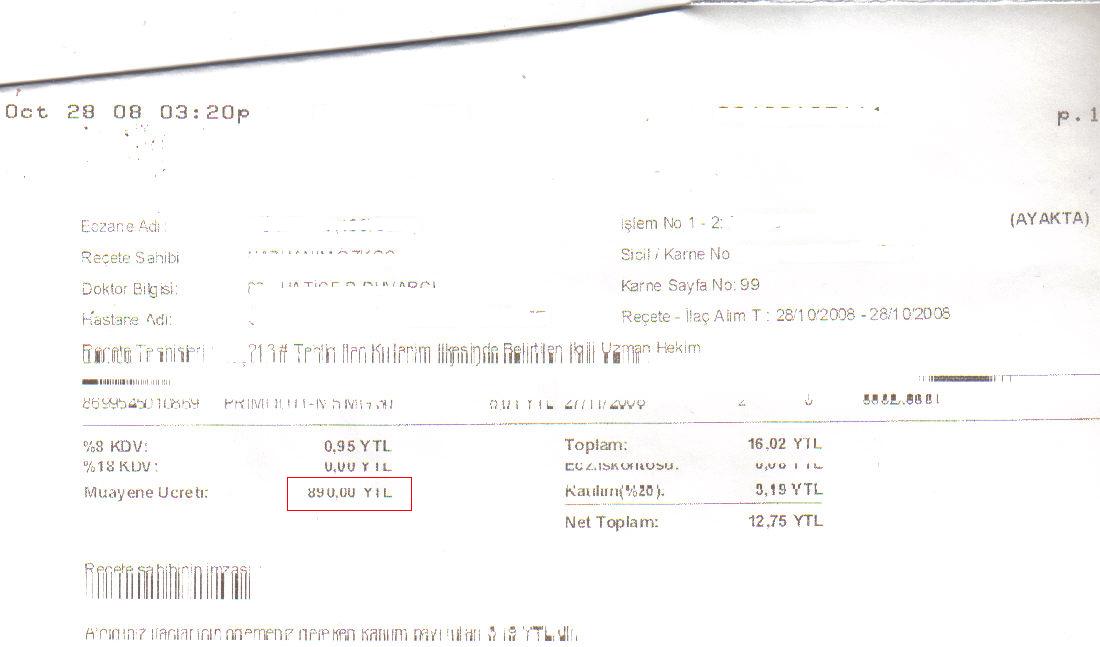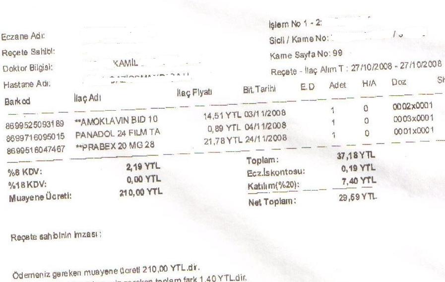 SGK Reçete Provizyon Sistemi iyice dağıldı. Eczacının Sesi e- Gazetemize ulaşan reçete çıktılarından en ilginci aşağıdakiler. Çıktılarda hastaya 890 ytl den 210 ytl ye kadar muayene ücretleri çıktığı görülüyor.