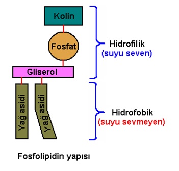 - Fosfolipid 2 yağ asidi ve bir gliserol molekülünde oluşmaktadır yapısında doğal olarak kolinde bulunmaktadır. Hem yağda hem suda çözünür ampifilik özelliğe sahiptir. (gliserol ve kolin kısmı suda; yağ asidi kısmı yağda çözünür)