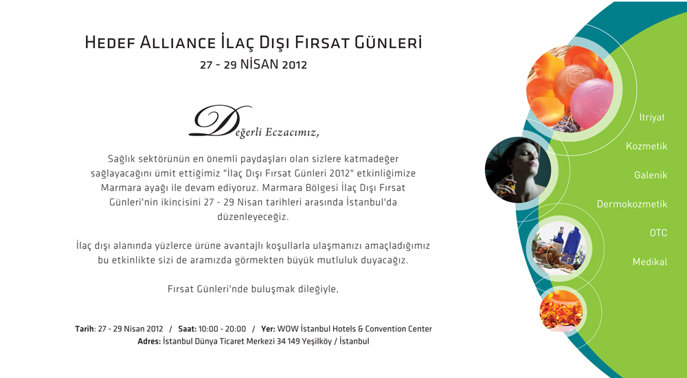 Hedef Alliance İlaç Dışı Fırsat Günleri 2012 programının Ege ayağı 24-26 Şubat tarihlerinde Kaya İzmir Termal Otel’de, İç Anadolu ayağı 2-4 Mart tarihlerinde Ankara Ticaret Odası Kongre Merkezi’nde, Akdeniz ayağı ise 9-11 Mart tarihlerinde Maritim Pine Beach Resort Belek’de gerçekleştirilmişti.
