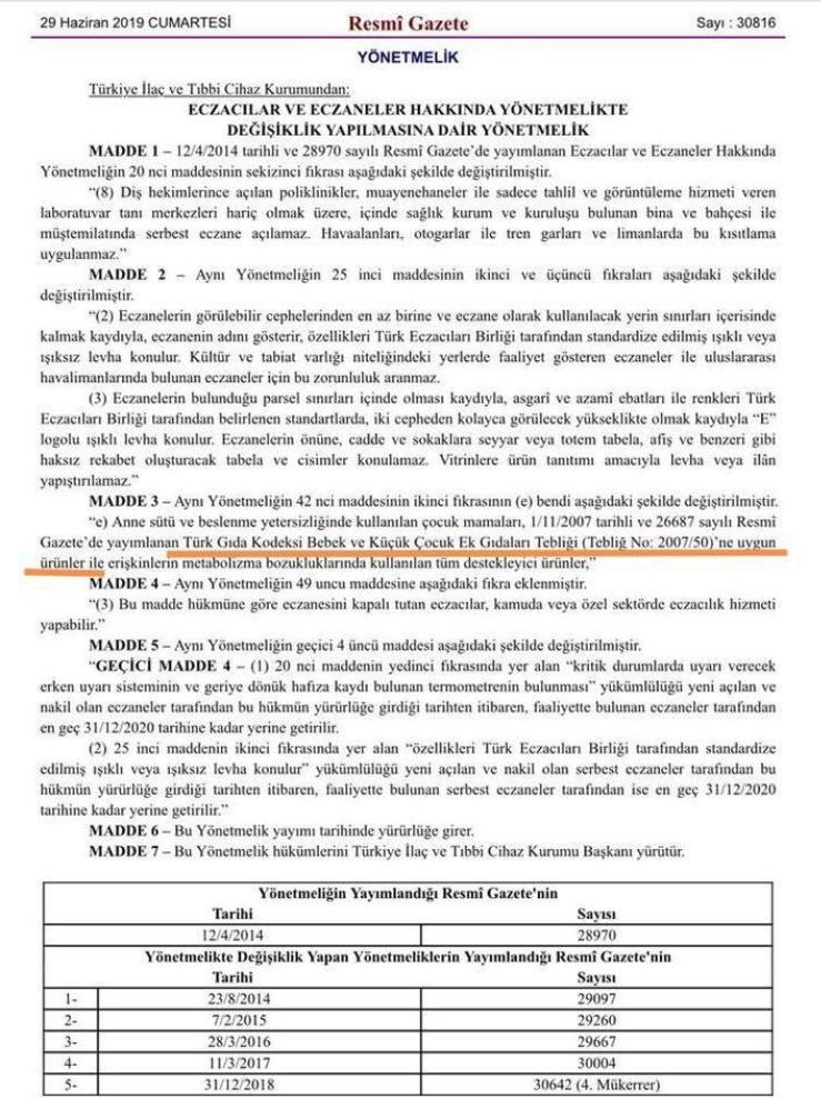 Eczacılar ve Eczaneler Hakkında Yönetmelik 6. bölüm 42. madde 2. Fıkrası e) bendinde yer alan “e) (Değişik:RG-29/6/2019-30816) Anne sütü ve beslenme yetersizliğinde kullanılan çocuk mamaları, 1/11/2007 tarihli ve 26687 sayılı Resmî Gazete’de yayımlanan Türk Gıda Kodeksi Bebek ve Küçük Çocuk Ek Gıdaları Tebliği (Tebliğ No: 2007/50)’ne uygun ürünler ile erişkinlerin metabolizma bozukluklarında kullanılan tüm destekleyici ürünler,” , kapsamında ürünlerin satışı mümkün olmaktadır.