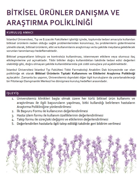 İTF Klinik Farmakoloji Uygulama ve Araştırma Polikliniği bünyesine eklenecek Bitkisel Ürünler Danışma ve Araştırma Polikliniğinde diğer kliniklerden hekimler tarafından yönlendirilen ya da doğrudan başvuran bitkisel ürün veya fitoterapötik kullanan ya da bu konuda bilgi almak isteyen hastalar, tıbbi açıdan hekimlerce incelenerek, uzman eczacılar ile birlikte değerlendirilecektir.