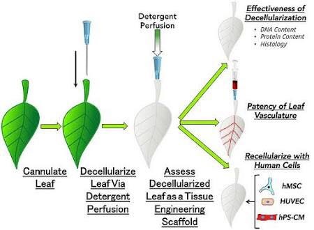 Yapraklardan önce bitki hücrelerini arındıran araştırmacılar, kalan selüloz yapı üzerinde yapay kalp yapmayı başardı.