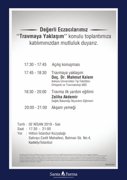 Santa Farma ve Farmazi Akademi’nin 2 Nisan 2019 Salı günü saat 17:00’de, Hilton İstanbul Kozyatağı’nda düzenlediği yemekli eğitim toplantısına davetlisiniz.