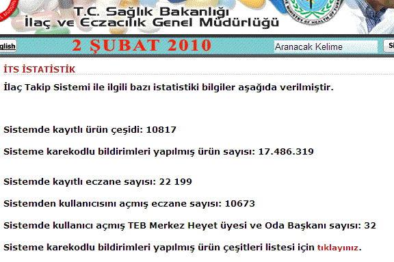 Sağlık Bakanlığı İlaç ve Eczacılık Genel Müdürlüğü bugün İTS' ye ilişkin bazı istatistik rakamlarını web sitesinden açıkladı.
