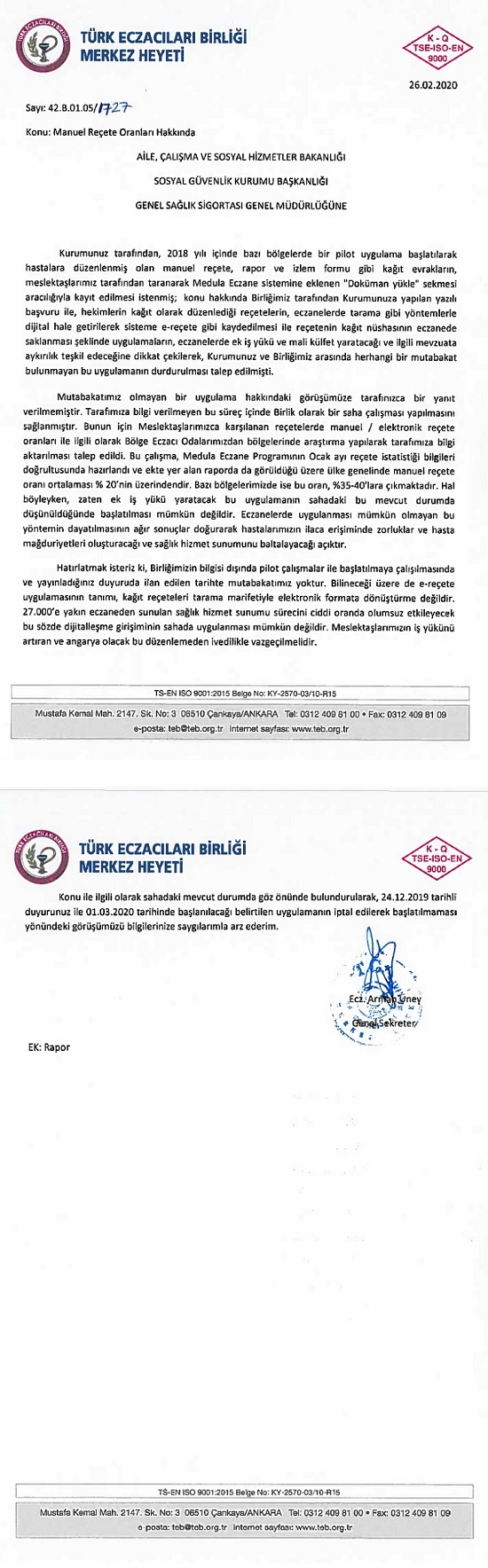 Kağıt reçetelerin taratılmasının uygulanamayacağı yönünde Sosyal Güvenlik Kurumu’na yapmış olduğumuz başvuru yazısı ve Bölge Eczacı Odalarımızın bölgelerinde kapsamlı araştırma yaparak Birliğimize ilettiği veriler doğrultusunda hazırlanan rapor aşağıda yer almaktadır.
