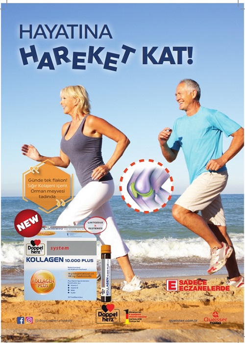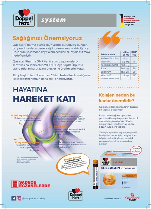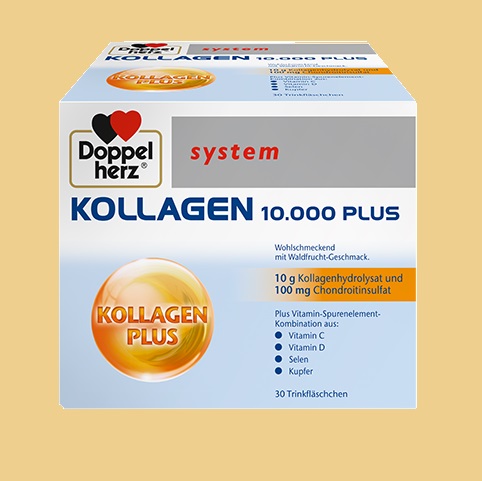 Doppelherz System Kollagen 10.000 Plus ürünü içerisinde 10.000mg hidrolize kolajen peptit, 100 mg Kondrotin sülfat, 60 mg C vitamini, 300 mcg Bakır, 16,5 mcg Selenyum ve 5 mcg Vitamin D bulunur.