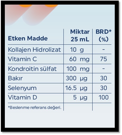 İçeriğinde bulunan hidrolize kolajen peptit miktarı öncellikli olarak eklem sağlığı üzerine efektif olup ayrıca cilt sağlığı üzerinde de destek olabilmektedir. Direkt içime uygundur. Orman meyvesi tadıyla içimi kolaydır. Laktozsuz & Glütensizdir.
